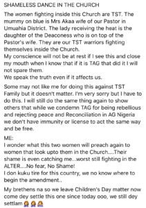 Mrs Akaa, the wife of an Assemblies of God Pastor in Umuahia district engaged the daughter of a church deaconess in a dirty fight.